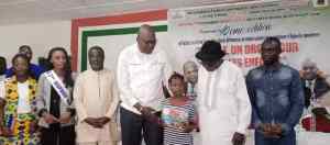 Touré Yacouba dit SFR, principal donateur de l’Ong ‘Le Manguier’, entouré des autorités municipales remettait des kits didactiques et des tenues scolaires à des élèves issus de familles défavorisées, en début de cette année scolaire à la salle des fêtes de la mairie d’Agboville.